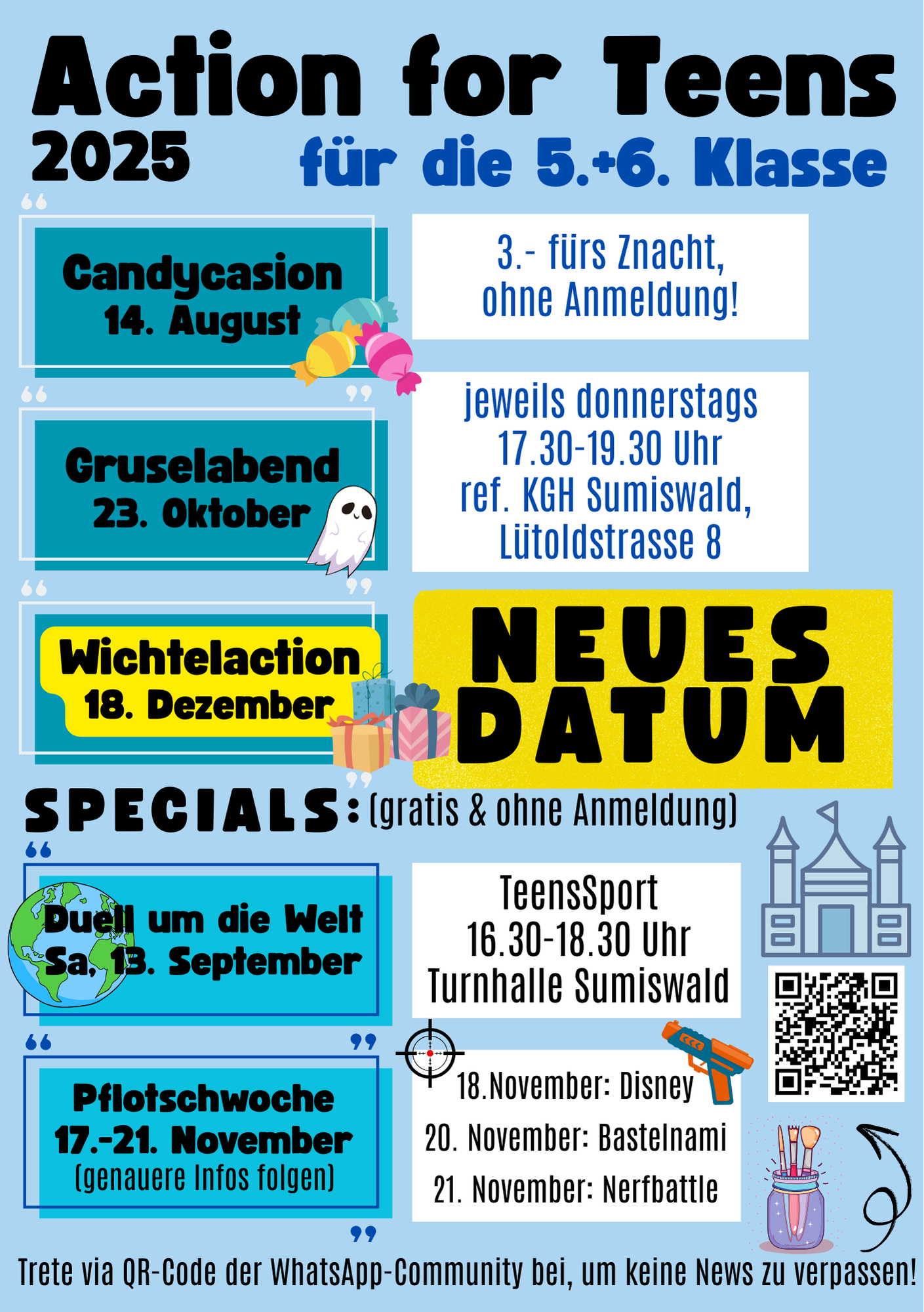 Die Sportnight diesen Samstag, 08.11. wird aus organisatorischen Gründen leider abgesagt. Es gibt aber auch gute Neuigkeiten: Im Januar 26 wird der Jugendtreff im Wasen eröffnet! Es erwarten euch eine grosse Eröffnungsparty und danach jeweils 1x pro Monat ein Jugendtreff (7.-9. Klasse). Sportnights finden im 2026 weiterhin, aber etwas sporadischer statt (3-4x pro Halbjahr). Genauere Infos folgen zu einem späteren Zeitpunkt. Wir sehen uns an der nächsten Sportnight am 06.12.